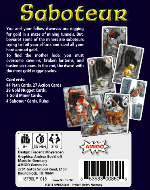 You're digging for gold deep in the shadowy maze of a mining tunnel, when suddenly a pick-axe shatters your lamp and the cavern goes pitch black. The saboteur has struck again...but who is the saboteur? Can you and your fellow miners complete a path to the hidden gold? Or will the saboteur thwart your efforts? With a unique combination of cooperation and betrayal, Saboteur reveals new secrets every time it's played.
